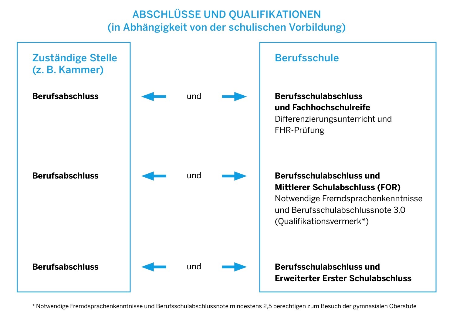 Wer den Mittleren Schulabschluss (Fachoberschulreife) erworben hat, kann im Berufskolleg nach der Ausbildung durch den Besuch der Fachoberschule Klasse 12 B die Fachhochschulreife erwerben. Im Anschluss an eine duale Berufsausbildung besteht zudem über die Fachoberschule 13 die Möglichkeit, die allgemeine Hochschulreife zu erwerben.